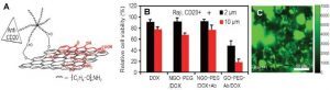 شکل ۱٫ A) بارگذاری DOX بر روی GO-PEG که با anti-CD20 antibody همبستگی تشکیل داده است B) سمیت سلولی در غلظت های مختلف DOX نشان دهنده آزادسازی هدف دار DOX در سلول های خاص است C) تصویر فلئوروسانس NIR از سلول های درمان شده