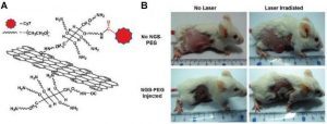 در این بخش یکی دیگر از کاربرد گرافن در زیست پزشکی معرفی خواهد شد. موفقیت های زیادی در زمینه بررسی گرافن برای دارورسانی در آزمایشات برون تنی بدست آمد که در مطالب قبلی سایت به آن ها پرداخته شد. برای درمان سرطان و برخی دیگر از بیماری ها لازم است تا آزمایشات درون تنی گرافن بارگذاری شده با داروها نیز مورد بررسی قرار گیرد. برای اولین بار لیو و همکاران جذب درون تنی تومور را مورد آزمایش قرار دادند و به درمان نور گرمایی بوسیله PEG-GO با مدل های ماوس تومور زنوگرافت پرداختند. آن ها جذب بسیار بالای تومور را بوسیله PEG-GO شاهد بودند و دلیل آن هم بازده بالای هدف گیری پسیو تومور بوسیله گرافن اکساید ناشی از اثر EPR است. به علاوه، با استفاده از NIR با توان کم بر روی تومور، تومور با بازده بالایی تخریب شد.