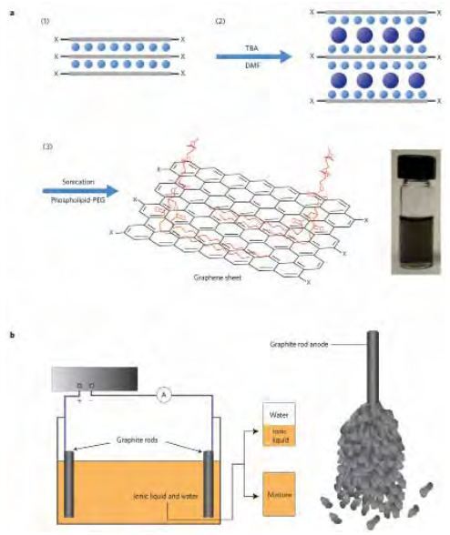 از عملیات الکتروشیمیایی گرافیت نیز در تولید سوسپانسیون کلوئیدی از ورقههای CMG استفاده شده است. میلههای تجاری گرافیتی به عنوان الکترود آند و کاتد در مخلوط دوفازی از آب و مایع یونی مبتنی بر ایمیدازولیوم غوطه ور شدند (شکل b3). پس از اعمال اختلاف قابلیتی معادل ۱۰ تا ۲۰ ولت، ورقههای گرافنی عامل دارشده به وسیلهی مایع یونی که ازاند گرافیتی نشأت گرفتهاند در ظرف رسوب میکنند. پس از تابش ماورای صوت میتوان CMG خشک شده را دوباره در حلالهای قطبی غیر پروتونی به حالت سوسپانسیونی درآورد (۱ میلیگرم بر میلیلیتر). ضخامت متوسط ورقههای CMG ایجادشده از یک سوسپانسیون DMF، با استفاده از AFM قابل اندازهگیری است و عدد ۱٫۱ نانومتر را نشان میدهد. پیشنهاد شده است که رادیکالهای ایمیدازولیوم که به صورت الکتروشیمیایی ایجاد شدهاند با پیوندهای کووالانسی و از طریق شکستن پیوندهای π به ورقههای گرافن متصل میشوند.